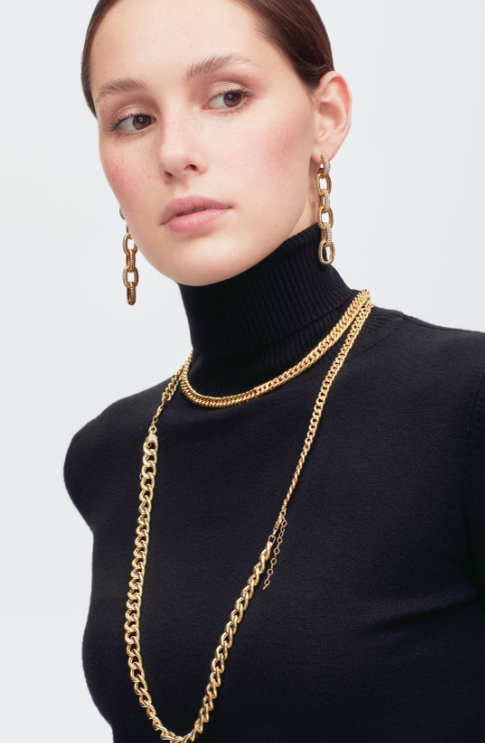 Меняется жизнь - меняются модные тенденции. Вспомните, до пандемии мир почти “сходил с ума” от минимализма в одежде и аксессуарах - пастельные тона, четкие силуэты, идеальная простота. От изобилия вокруг каждый стремился к спокойствию. Когда ковид ворвался в нашу жизнь, правила игры поменялись. Дизайнеры в своих коллекциях вновь стали использовать блестящие ткани, анималистичные принты, необычные фактуры. Прослеживается цикличность тенденций с акцентом на качество и осознанные эмоции от совершения покупки, а стилистические приемы 90-х и 2000-х вновь возвращаются в высокую моду. Что происходит в мире украшений, какие выбрать и с чем сочетать? Читайте в нашем обзоре! Крупные цепи - самый долгоиграющий тренд Сочетая их используйте принцип многослойности. Миксуйте маскулинное колье с женственными деталями, например, жемчугом, или, если же вы поклонник стиля гранж - добавьте к колье несколько цепей, но с еще более крупными звеньями. Такая комбинация красиво смотрится как на оголенных частях