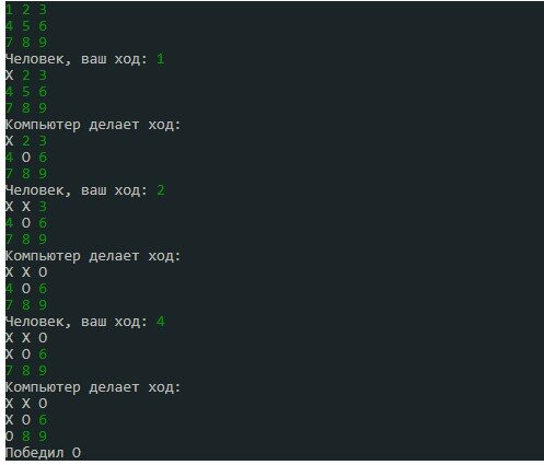 Создание игр - это кротчайший путь к изучению языка программирования. Особенно когда вы программируете знакомую вам игру. А крестики-нолики знакома всем с детства и вам не трудно будет придумывать алгоритм для компьютера. Сейчас мы на Python создадим игру крестики-нолики с полноценным искусственным интеллектом. Это будет игра в которой человек играет против компьютера. Алгоритм компьютера состоит из 5 простых шагов, но он получился таким пуленепробиваемым, что выиграть его нельзя. Можно только свести игру к ничьей. Внешний вид игры крестики-нолики на Python Я сознательно не стал создавать визуальную форму для игры. Игра в спартанском стиле - в консоли. Это я сделал для того чтобы не отвлекаться от сути игры. Ведь мы учимся сейчас не формочки программировать. Подобных уроков в youtube итак множество. Мы будем учиться писать именно алгоритм. Алгоритм для основного цикла игры и алгоритм для искусственного интеллекта для бота. По этому вот так будет выглядеть процесс игры: Поле у нас это н