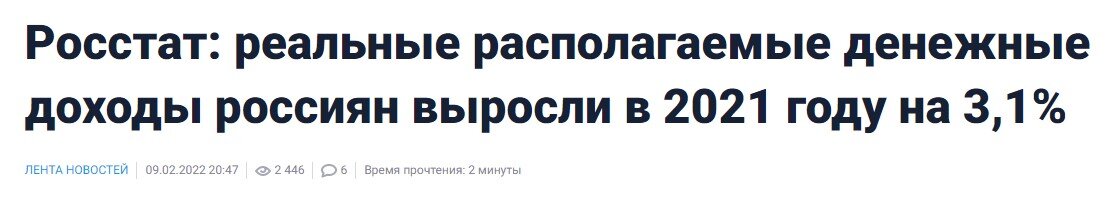 Росстат опубликовал данные по динамике реальных доходов граждан, из которых следует, что за 2021 год они выросли на 3,1%. Реальные располагаемые доходы - это доходы, остающиеся в распоряжении человека после оплаты всех обязательных платежей, включая кредитные, и скорректированные на уровень инфляции. СМИ не забыли упомянуть, что рост стал рекордным (в данном случае, как выразились, "крупнейшим") с 2013 года, но при этом подчеркнули, что сравнивать показатели нельзя, поскольку с 2019 года Росстат изменил методику подсчета (и в дальнейшем корректировал ее несколько раз). Получается, что "новые" реальные доходы "уже не те, что старые". В абсолютном выражении, по подсчетам Росстата, среднедушевой доход в 2021 году составил 39854 рубля в месяц, что на 10,5% больше, чем в 2020 году. В структуре доходов выросли доли доходов от предпринимательской деятельности, зарплаты, но снизилась доля социальных выплат и доходов от собственности. Как это было на протяжении всего 2021 года, рекордный рост с
