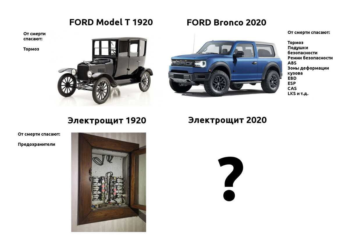 Автомобили, как и электричество используют уже сотню лет, и за это время напридумывали много разных технических штук, что бы не отправиться в мир иной раньше времени. При этом, если с автомобилями средний человек в курсе прогресса (подушки безопасности, антиблокировочная система и т.д.) то вот с электричеством как то не очень. Проиллюстрирую это картинкой:
