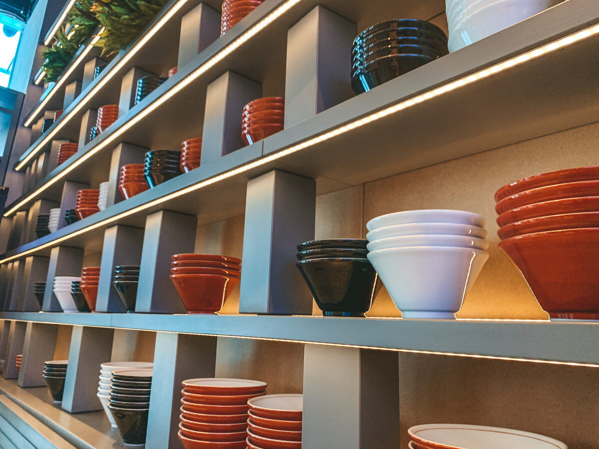 Интерьер просторного, шумного зала с открытой кухней, панорамным окном с видом на Большую Грузинскую и мебелью из светлого дерева минималистичный, в стиле "лофт". Одну из стен занимает композиция из мисок для рамена, напротив - витрина с напитками и барная зона.