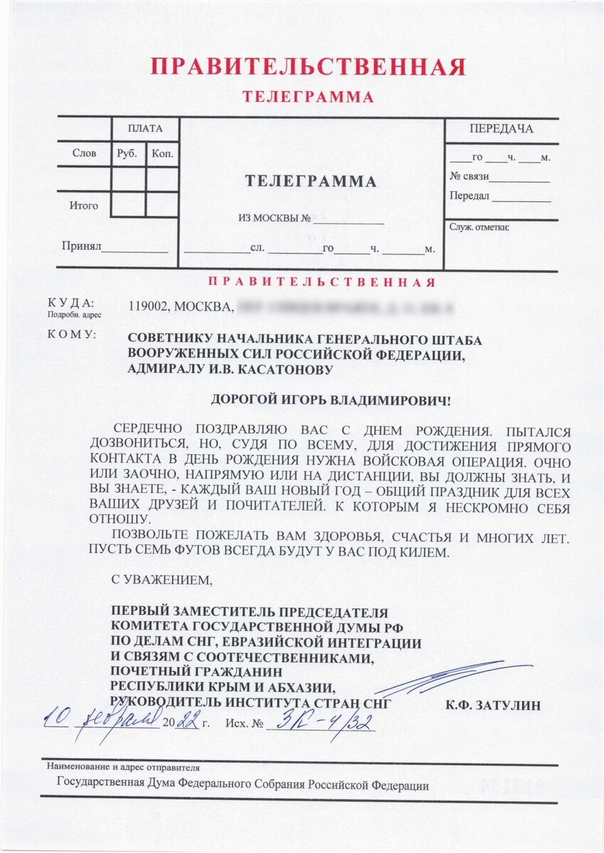 Депутат Государственной Думы России Константин Затулин направил Правительственную телеграмму Советнику Начальника Генерального штаба Вооруженных сил Российской Федерации И.В. Касатонову с поздравлением с Днем рождения.