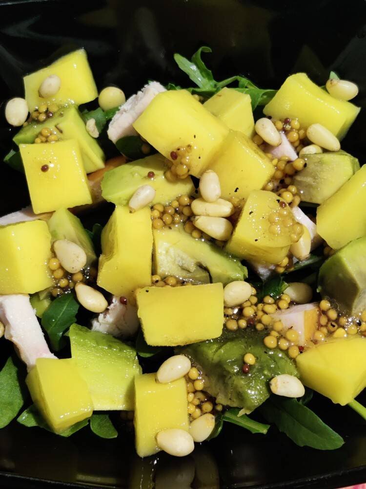 Ингредиенты: Манго, Авокадо, Копчёная куриная грудка, Руккола, Кедровые орешки, Оливковое масло, Соль, перец, Лимонный сок, Горчица зернистая Способ приготовления: Руккола. Нарезаем: Куриную грудку. Авокадо. Манго. Делаем заправку: смешиваем оливковое масло + соль + перец + горчицу + сок лимонный. Поливаем наш салат и добавляем кедровые орешки. А теперь ☝️... Вкусно кушаем 😘