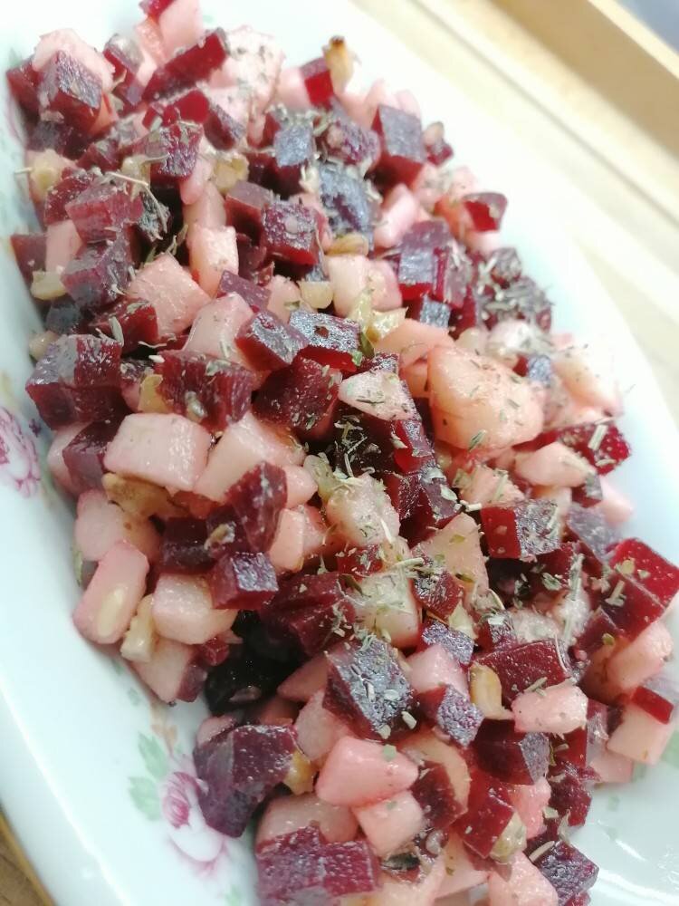 #игры Быстрый салатик для любителей ПП. Быстро, легко и вкусно.... 🥗 Ингредиенты: Красная свёкла , средних яблока, ядер грецкого ореха, Соль, перец чёрный , лимонного сока, Растительное масло Способ приготовления: Свёклу отварить или запечь в духовке, почистить и порезать мелким кубиком. Можно и натереть на терке. Яблоки почистить и порезать так же мелким кубиком и заправить лимонным соком. Ядра ореха поджарить на сухой сковороде, остудить и порезать мелко но не в крошку (орехи должны чувствоваться в салате) Соединить все ингредиенты, добавить специи и заправить растительным маслом. Всем всего доброго ❤️