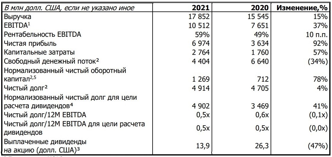 ГМК Норникель опубликовал финансовую отчетность за 2021 год по МСФО. Норникель одна из компаний, публикующих отчетность в двух валютах - российских рублях и долларах США. Так как компания - экспортер, с ценами продукцию, торгующуюся на мировых рынках в долларах, то и анализировать целесообразнее отчет в долларах. Отчет, хоть и не удививший аналитиков, но в целом позитивный, содержащий очень много рекордных для компании значений (таблица с ключевыми параметрами из пресс-релиза НН): Следует отметить: — Выручка выросла благодаря сильной конъюнктуре корзины металлов Норникеля, несмотря даже на коррекцию цен на палладий и значительное снижение объемов производства (всей корзины металлов, а особенно никеля и меди) после аварий на рудниках; — EBITDA превысила 10 млрд. долларов, при рекордно высокой рентабельности в 59%; — Чистая прибыль взлетела почти в 2 раза, до фантастической рекордной отметки; — Начался уверенный рост капитальных затрат, и по всей видимости, это надолго — компания после
