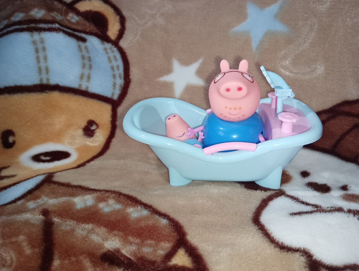 Доброе утро! На днях получила с Ozon новый игровой набор свинки Пеппы. На самом деле очень даже много игрушек продаётся на их тематику. Выбор большой, но цены кусаются. Стоимость и впечатления: Купили мы игровой набор " Ванная комната свинки Пеппы " по скидке за 387.60 рублей. Я специально поглядывала, когда стоимость снизится. И вот проснувшись рано утром, достала такой сюрприз для ребёнка. Дочка очень обрадовалась, ходила с коробкой в обнимку, пока я доставала ножницы. И вот коробка открыта и с радостью достаётся ванная и Папа свин с сыном Джорджем. Игрушки очень качественно сделаны. Ножки сгибаются, фигурки могут стоять и сидеть. Единственное ручки не фиксируются у свинок, но может это так было задумано. Кто его знает? Это первый наш набор со свинкой Пеппой. В итоге, игровой набор "Ванная комната свинки Пеппы" рекомендую. Очень увлекает ребёнка, а также развивает мышление, логику, фантазию и мелкую моторику.