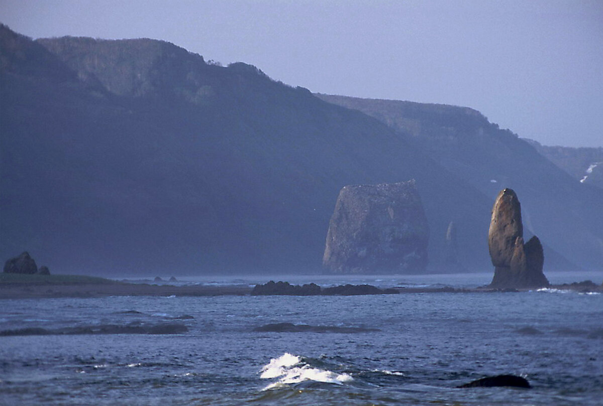 В сумерках я вышел на берег. Мыс Козлова - живописное место: изба стоит на правом берегу реки, дальше на юг идет почти 10 км черного пляжа до реки Выдровой, кое-где его пересекают небольшие останцы - причудливой формы скалы - остатки коренного берега, образовавшиеся в результате совместной разрушительной деятельности ветра, осадков и океана. Мне хотелось провести несколько дней в скрадке около гнезда орланов, которое, как я знал, было устроено на одном из таких останцов недалеко от избушки, чтобы понять, чем хищники выкармливают здесь своих птенцов. Было интересно, как белоплечие орланы, тесно связанные в своем питании с лососями, выживают в условиях, где нерестовых рек не так много, а большая часть из них носит горный характер, то есть имеет быстрое течение и мутную, непрозрачную воду. Кстати, уже то, что орланы предпочитают устраивать гнезда не на деревьях, а на скалах, сильно отличает стратегию птиц, гнездящихся вдоль морского побережья Кроноцкого полуострова от привычной для меня