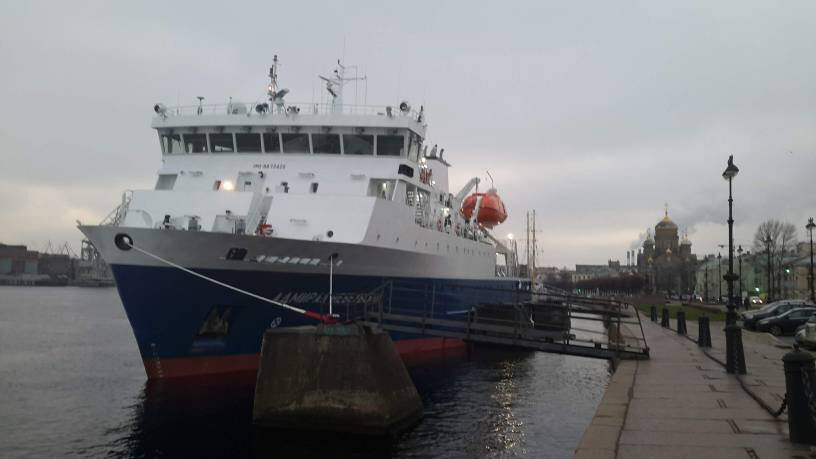 Судно, обратите внимание, ошвартовано у причала набережной Лейтенанта Шмидта совсем рядом с памятником еще одному известному мореплавателю, руководившему первой русской кругосветной экспедицией,- Ивану Фёдоровичу Крузенштерну. В свою очередь, Геннадий Невельской поступил в Морской кадетский корпус 8 апреля 1829 года. В то время его начальником был как раз И. Ф. Крузенштерн.