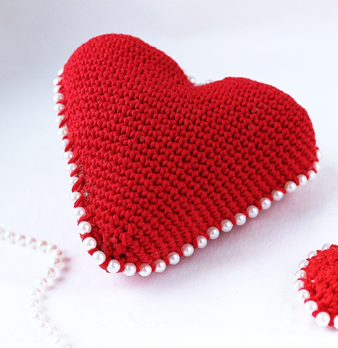 Если будете расшивать бусинами, то можно использовать уже готовые бусы на леске, их очень быстро можно пришить за леску, которая оставлена между бусинами: подцепляете нить сердца, накидываете на леску между бусинами и опять цепляете нить за сердце. Так пришиваете по всему периметру сердца.
