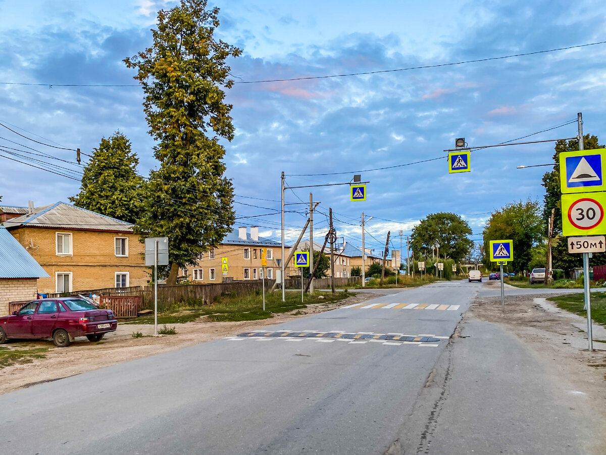 Путешествуя по Рязанской области, на ночь мы остановились в гостевом доме, что находится в микрорайоне Октябрьский города Скопина. И вот, заселившись, мы отправились немного прогуляться по этому микрорайону, посмотреть, как он живет. В целом, Октябрьский больше мне показался не микрорайоном, а отдельным населенным пункт. Впрочем, так и было до 2004 года, когда Октябрьский имел статус поселка городского типа. В 2004 году административный статус Октябрьского упразднили, и он стал микрорайоном Скопина. Микрорайон Октябрьский еще известен тем, что в нем находится исправительная колония №3 для бывших работников судов и правоохранительных органов. Но несмотря на близость зоны, микрорайон оказался тихим и вполне уютным. Думаю, он отлично подошел бы для спокойной размеренной жизни. Вот как выглядит одна из основных улиц микрорайона. Дороги там, кстати, вполне неплохие. Асфальтовое покрытие вроде без ям, и даже лежачих полицейских положили на дорогу, чтобы быстро не гоняли. Дома, в которых про