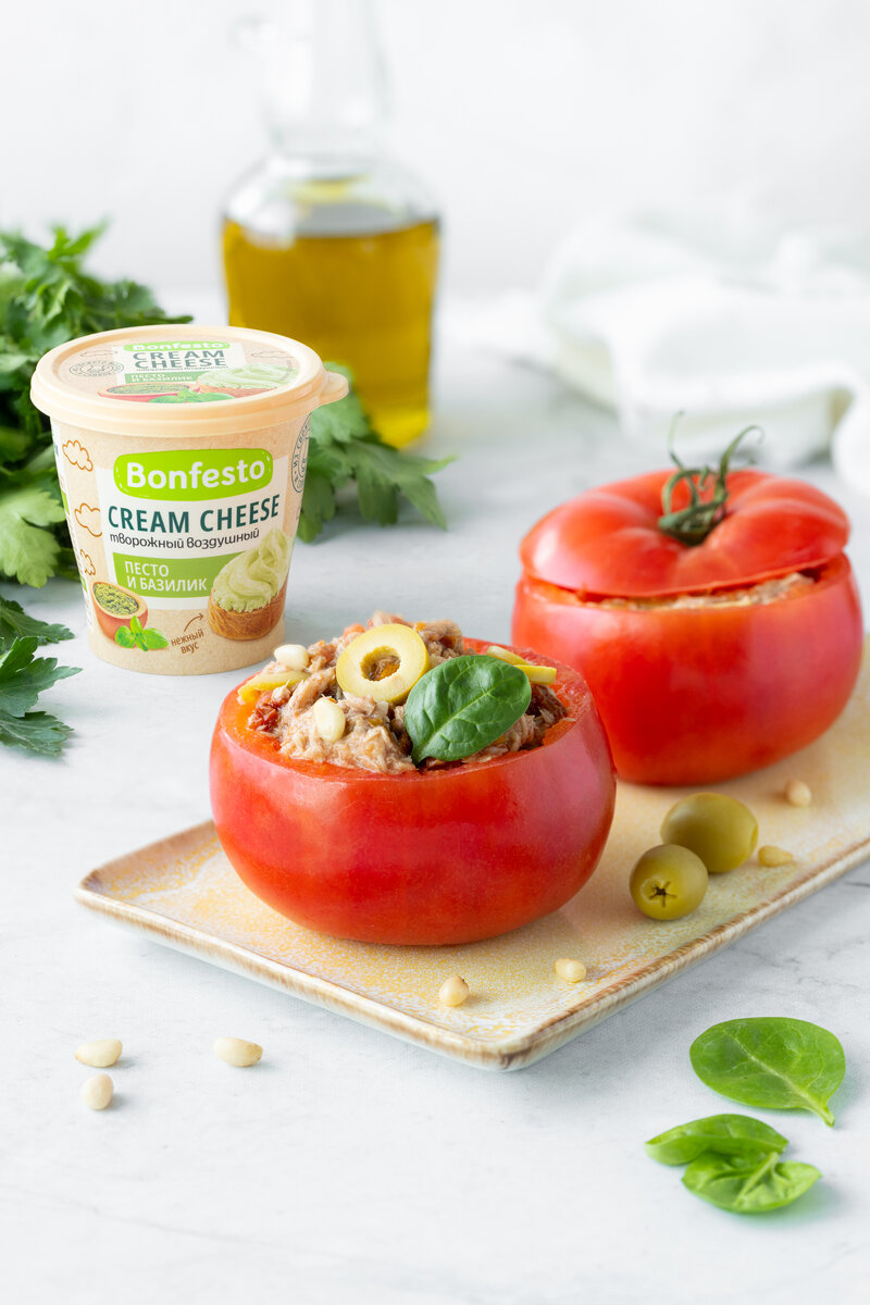 Помидоры, фаршированные воздушным Cream Cheese Bonfesto «Песто и базилик» и тунцом — эффектная и такая простая в приготовлении закуска 👍