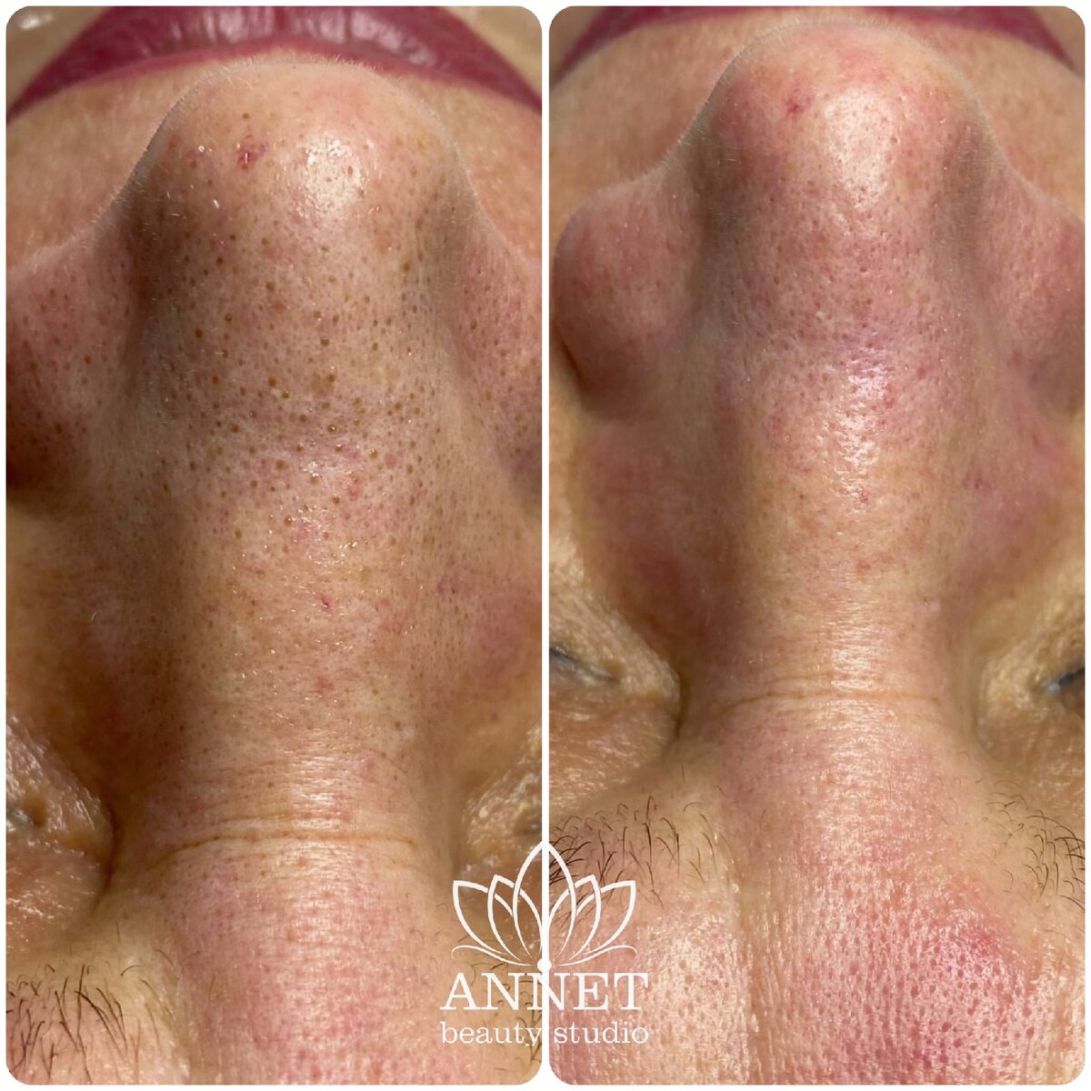 Гидропилинг — очищение кожи с помощью смеси воды и воздуха. На фото ДО и ПОСЛЕ гидропилинга - красивая, чистая кожа на проблемном носике сразу после одной процедуры. Вакуумное воздействие позволяет быстро очистить поры, удалить сальные отложения и различные загрязнения. Кроме того, вакуум усиливает регенерацию клеток эпидермиса, проводит лимфодренаж и лифтинг кожных покровов. Процедура делается с помощью специального аппарата, который с большей скоростью абсорбирует загрязнения через специальную насадку. В процедуру входит ультразвуковая чистка, которая удаляет остатки загрязнений, излишки сального секрета и ороговевшие частицы эпидермиса. Кожа становится ровной, гладкой, сияющей и увлажнённой. Исчезает грубый роговой слой, сужаются поры. Подробнее об процедуре смотрите на сайте