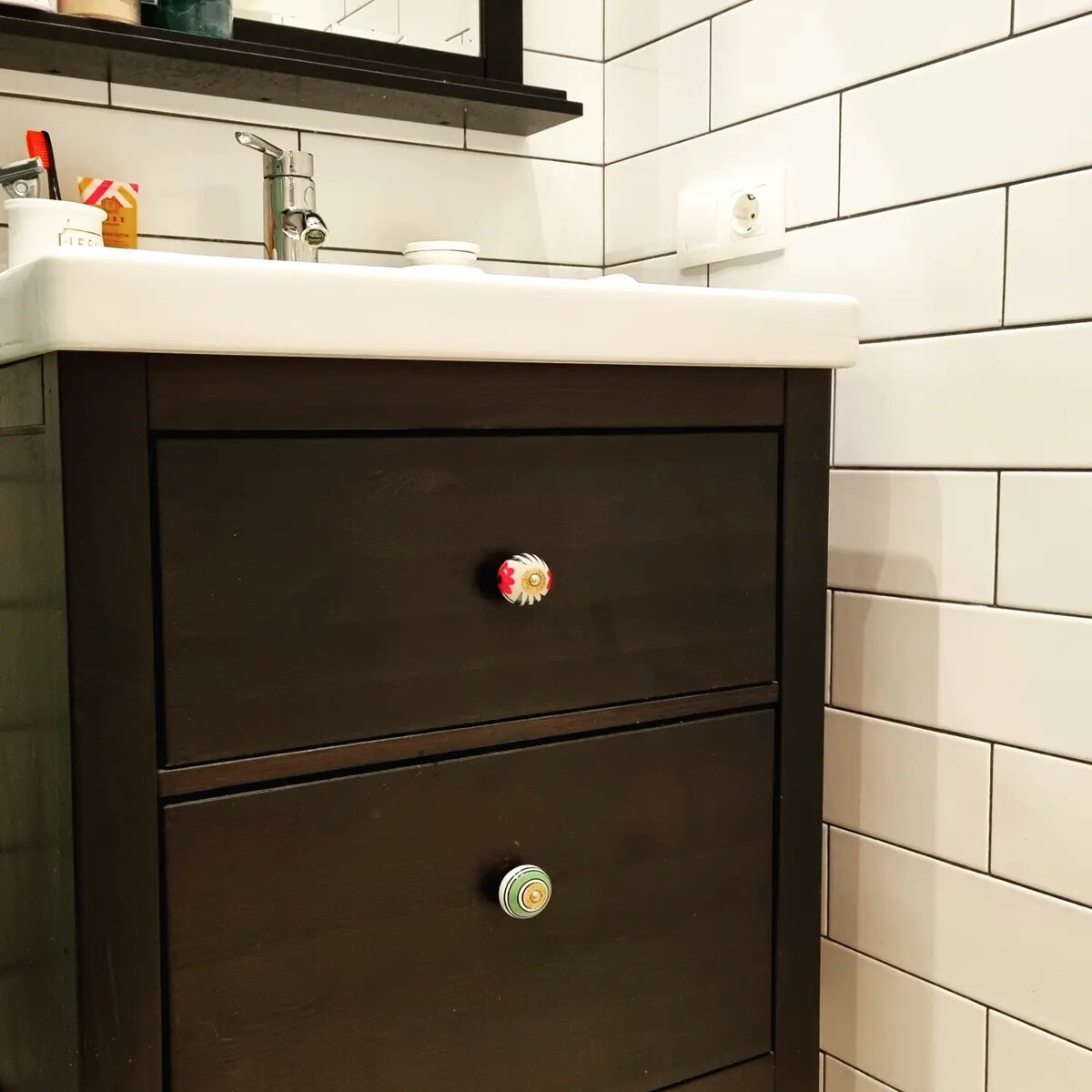Бюджет преображения этой тумбы из Икеа - 500 рублей. В конце статьи расскажу, где найти шикарные керамические ручки по 250 рублей за штуку. Я давно заметила, что производители мебели особо не заморачиваются, какие ручки они ставят на свои шкафы и тумбы. Между тем, ручка может полностью преобразить предмет. Вот для сравнения фото тумбы из этой серии со стоковыми ручками. Поэтому я уверена, ручки надо менять. Хотя бы иногда. Может, поэтому есть целые магазины, где можно подобрать фурнитуру для мебели на свой вкус. Я предпочитаю яркие! Эти кнобы - ручной работы. Они все немного отличаются друг от друга и по форме, и по рисунку. Эти ручки на любителя и поэтому производятся они небольшими партиями. Их привозит прямо из Индии лавка "7 слонов". На сайте можно посмотреть варианты рисунка и оформить доставку. А как вы преображаете свою мебель? Пишите о своих находках в комментариях!