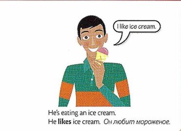 I like ice cream - я люблю мороженное. Это его характеристика, свойство этого парня. He's eating an ice cream. Но он е