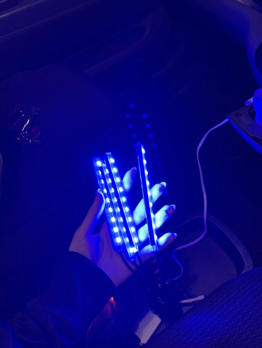 Всем привет 👋🏻. Хочу вам рассказать про подсветку в салоне автомобиля, у нее также есть плюсы и минусы. ➕➖ В моем случае, подсветка проводная, работает от прикуривателя , продается практически везде: в интернет магазинах , на рынках. О ней есть много отзывов, но как правило отзывы сразу после установки. Я проверила ее на работоспособность , прошло много времени и ничего пока не сломалось 😅 И так , начну с плюсов: ➕Конечно же визуальное удовольствие. Подсветка светится интересно, можно выбрать разные цвета и режимы, убавить или увеличить яркость 🔆 ➕В комплекте идет пульт, это очень удобно.👍🏻 ➕Сильная липучка. Сами светящиеся полоски - на липучке, которые клеятся к автомобилю. ➕ Небольшая цена. Ну тут все понятно без объяснений. 🪙 Минусы: ➖Иногда, на совсем темном участке дороги, подсветка может отвлекать. Да, это так , например, при парковке её лучше выключить. ➖Может мешаться под ногами. Все провода я прятала под коврик, но сами светящиеся полоски могут мешать обув
