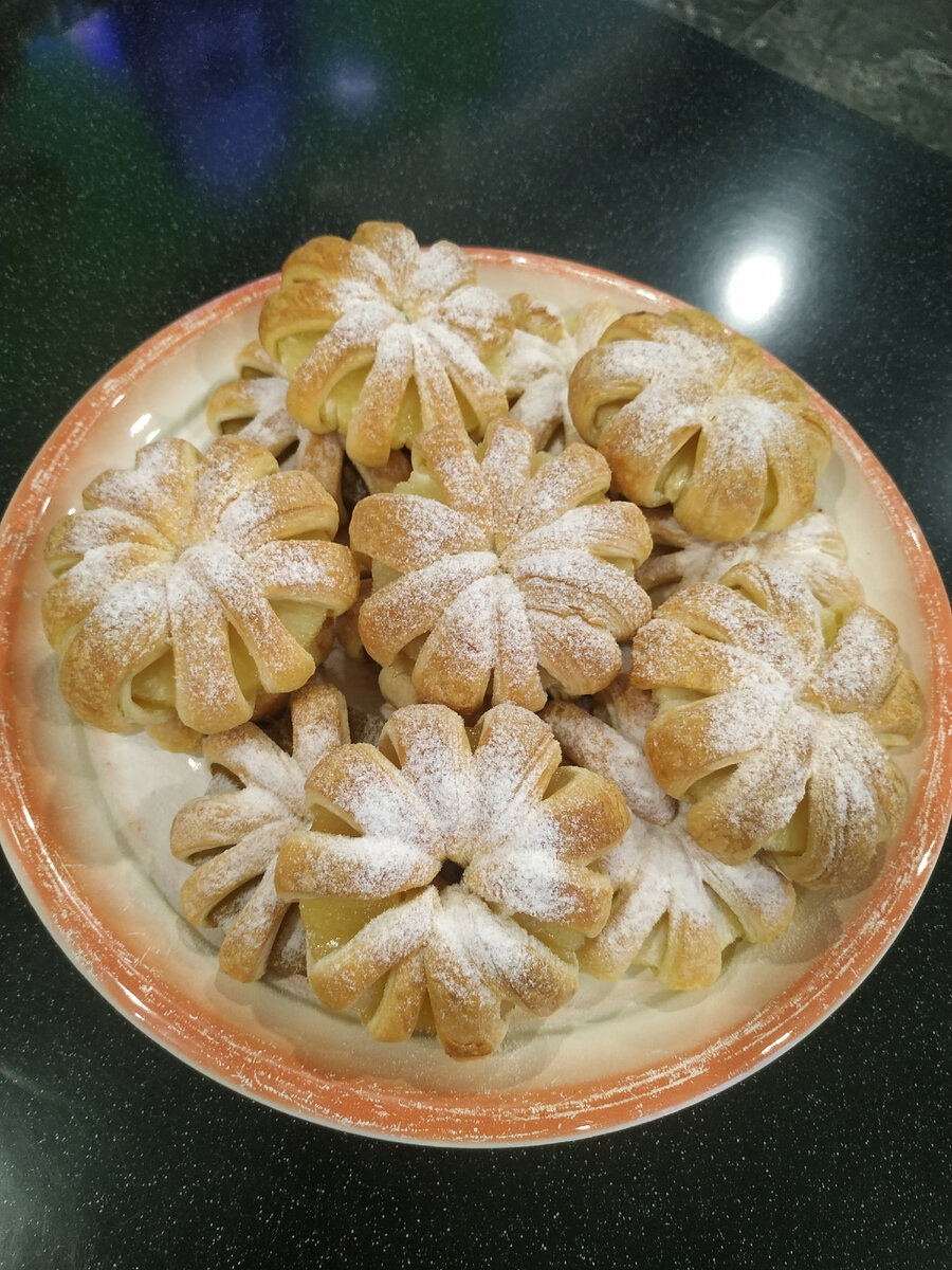 Вы пробовали когда-нибудь такие слоечки? Это очень вкусно, и самое главное, времени требуется совсем немного. Я покупаю готовое слоеное дрожжевое тесто и парочку банок консервированных ананасов, только не кусочками порезанные, а кольцами. Тесто размораживаем, слегка раскатываем, затем режем на полосочки, шириной примерно полтора см. Беру кружок ананаса и полосочкой теста вокруг кольца обматываю. Получается как ромашка. Готовые пирожки выкладываю на застеленный пергаментом противень и в духовку. Готовятся при температуре 170 градусов (верх/низ) минут 30-35. Но смотрите по своей духовке. Ориентируйтесь на цвет булочек. Как только зарумянятся, появится красивый цвет, булочки значит готовы. Вынимаем, посыпаем при желании сахарной пудрой. Это очень вкусно и оригинально, а также красиво смотрятся на столе. Попробуйте, не пожалеете! Порадуйте своих близких!
