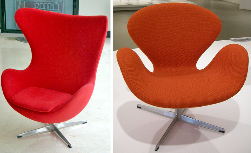 Основой стиля Якобсена было гармоничное сочетание естественности и точности, продуманности до мельчайших деталей и лаконичности образа в целом. Специалисты описывают основные элементы стиля как смесь функционализма, перфекционизма и ар-деко. И н т е р е с н о: создавая новые проекты, Арне разрабатывал их полностью, от базовой концепции до мелких деталей дизайна. Например, в дизайне отеля Radisson SAS Royal (отель Radisson Royal) им был разработан даже текстиль для постельных принадлежностей и столовых приборов. Мебель: функциональность и эргономика нового поколения Среди успешно продающихся до сих пор разработок датского дизайнера в первую очередь стоит назвать уникальные кресла Арне Якобсена. Egg и Swan Swan и Egg были спроектированы еще в 1950-е годы и с тех пор никогда не выходили из моды: датская компания Fritz Hansen продает эти стулья и кресла миллионными тиражами. Их запоминающиеся силуэты можно видеть в рекламных роликах и кинофильмах, в домах селебрити и в интерьерах люксовых