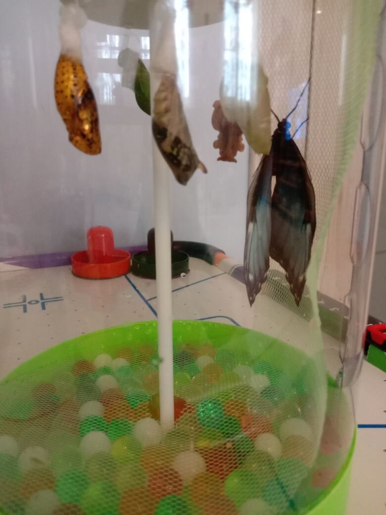 «Бабочки зимой?! Да еще и прямо у вас дома?! Возможно ли это?» – спросите вы. И я скажу, что нет ничего невозможного. Этой зимой нам захотелось хоть ненадолго вернуться в лето. В этом нам помогло приобретение бабочкариума. Сейчас есть множество фирм, которые предлагают вырастить бабочек за довольно короткий срок прямо у себя дома. Остается только выбрать количество бабочек и их внешний вид. Чем больше бабочек и чем они крупнее, тем выше цена. Сам набор включает в себя несколько куколок бабочек (которых вы сами выбрали), небольшую конструкцию для созревания этих самых куколок и гидрогелевые шары, чтобы в бабочкариуме было тепло и влажно. Так же прилагается подробнейшая инструкция, как потом обращаться с бабочками, чем кормить, при какой температуре содержать. Наши бабочки вывелись уже на второй день нахождения в бабочкариуме. Две из них появились сразу. Остальные рождались с разницей примерно в один день. Появление из кокона нескольких бабочек нам даже удалось застать и наблюдать за эти