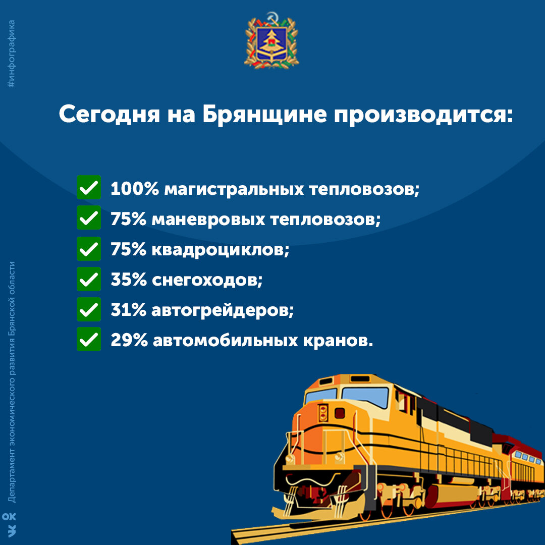 В сравнении с общероссийскими показателями, по последним данным, Брянщина выпускает 100% отечественных магистральных тепловозов, 75% маневровых тепловозов, 75% квадроциклов, 35% снегоходов, 31% автогрейдеров, 29% автомобильных кранов. Лидирующие позиции у региона по промпроизводству картофеля, а по урожайности «второго хлеба» регион первый в ЦФО и второй в России. Первое и второе места соответственно область занимает по производству говядины и поголовью КРС.