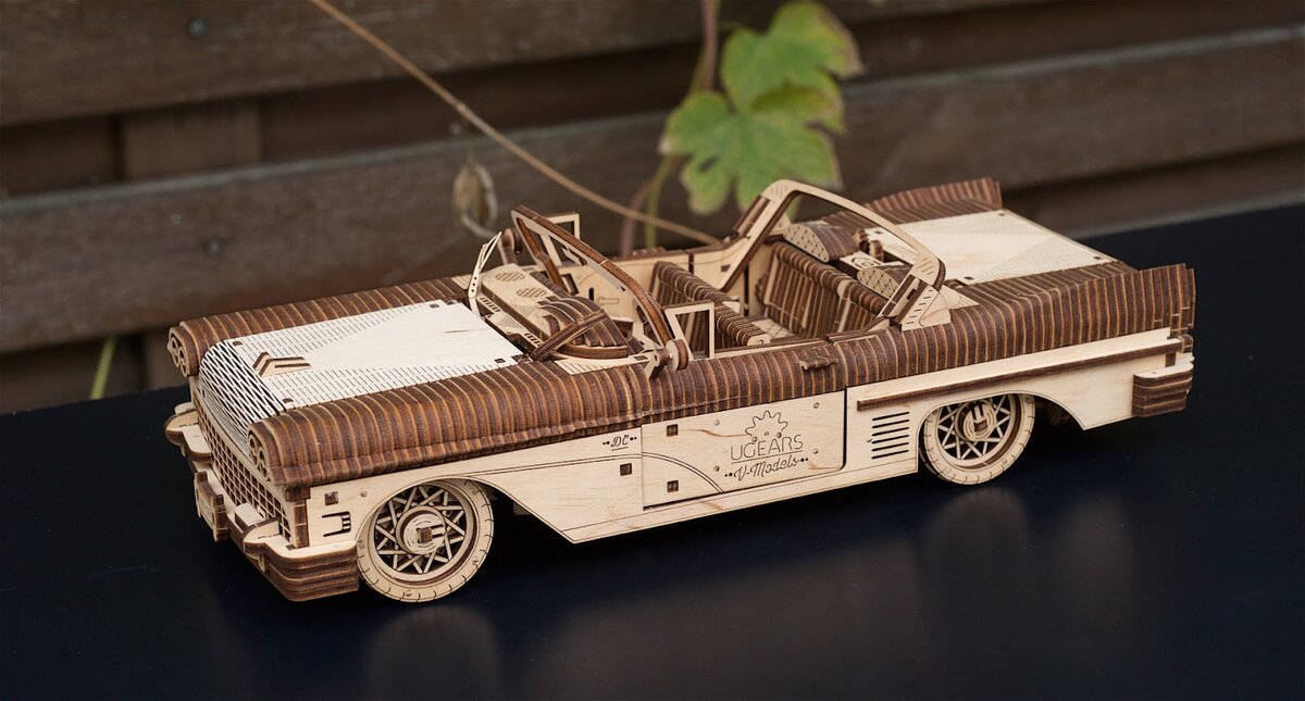 Меня такой конструктор впечатлил, и я подумала, что мужу он наверняка тоже понравится. Оставалось найти подходящий набор. С этим возникли трудности – на сайте Ugears 80+ наборов на любой вкус и кошелек, выбрать действительно есть из чего. Для начала остановилась на таком «кабриолете мечты» родом из 50-х годов. В конце концов, мужчины – это повзрослевшие мальчики, которые в восторге от крутых машинок:)