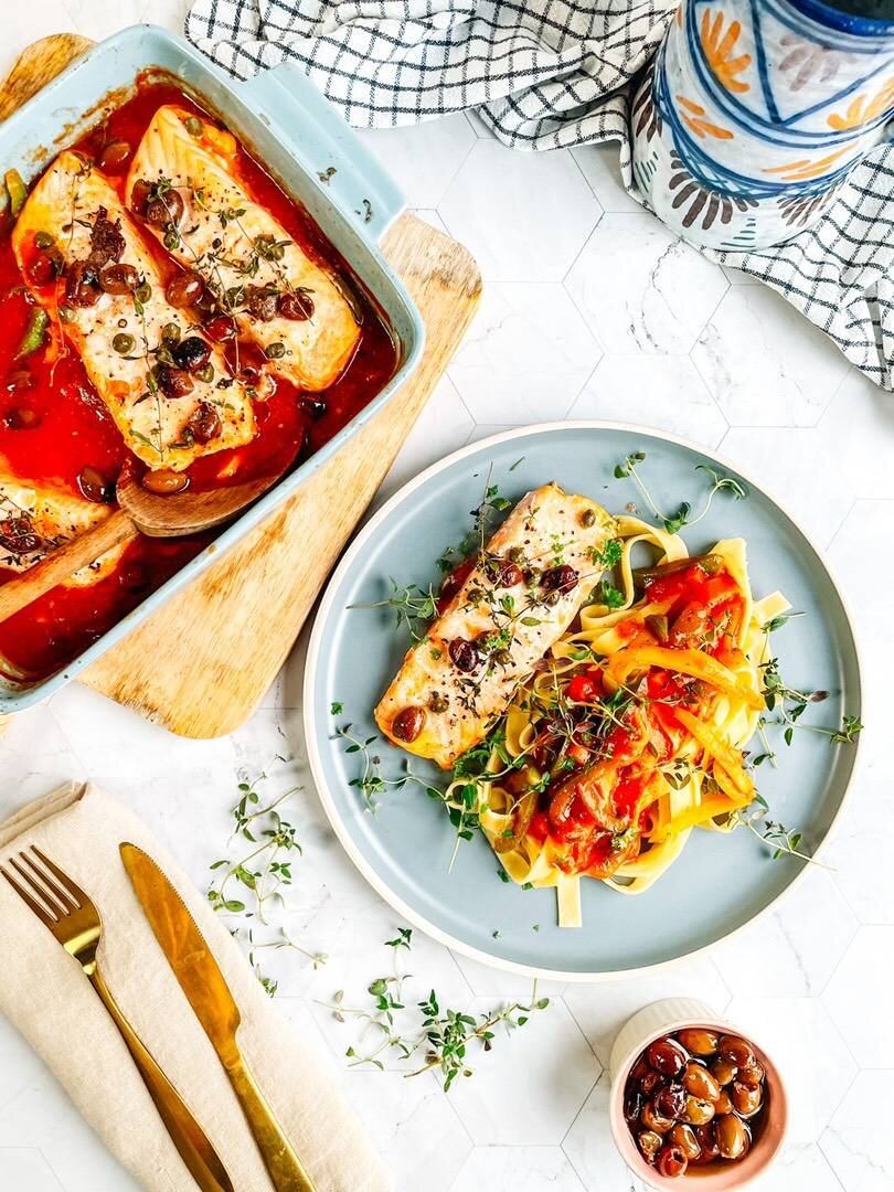 Если вы ещё не решили, что приготовить на ужин, то вот вам мой совет :) #игры Ингредиенты: стейк лосося, зелёный сладкий перец, желтый сладкий перец, свежий тимьян, темные оливки, свежая паста, томатный соус, каперсы, Оливковое масло, Соль, перец Способ приготовления: Нарезать перец соломкой и выложить на дно формы. Полить паприку соусом. Сверху положить стейки лосося * На лосось бросить оливки и каперсы * Полить оливковым маслом и положить сверху веточки свежего тимьяна. Посолить, посыпать перцем молотым * Поставить в разогретую до 200° духовку на 20 минут. Сварить пасту * При подаче пасту полить соусом.