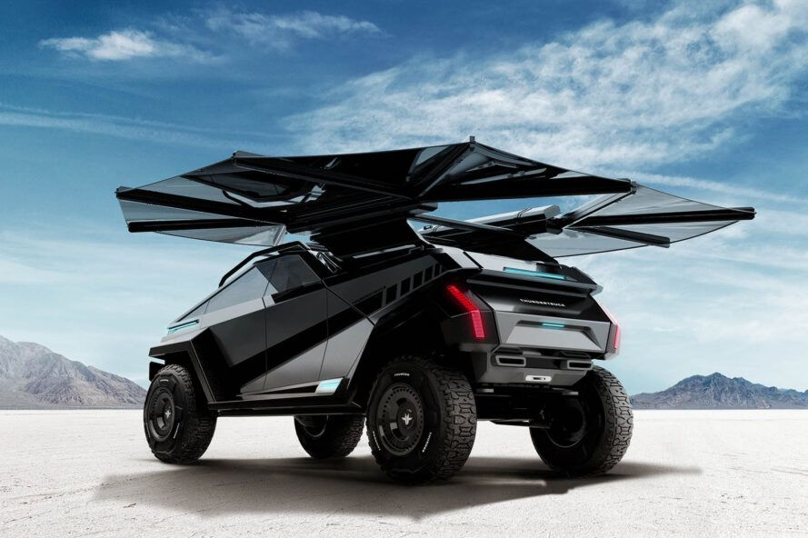 Электромобиль Thundertruck представляет собой прочный и футуристический концепт грузовика на солнечных батареях с крыльями летучей мыши, заряжаемыми от солнечной энергии наверху, для зарядки вне сети. Но действительно ли кто-то это делает? Еще нет. Thundertruck EV — это электрический грузовик мощностью 800 лошадиных сил с визуализацией интерьера и экстерьера и PR-кампанией. Концепция Thundertruck, придуманная рекламным агентством из Лос-Анджелеса Wolfgang LA, бросает вызов существующим принципам автомобильного дизайна. Как поясняется на веб-сайте Thundertruck: «Когда COVID впервые появился, люди искали способы занять свое время. Вместо того, чтобы печь хлеб или собирать пазлы, мы решили сделать новый современный электрогрузовик». Проект Thundertruck вдохновленный австралийской глубинкой и молодыми авантюристами, уходящим в автономном режиме, открывает новые возможности для электромобилей. Теоретические характеристики Thundertruck оценивают дальность полета от 400 до 600 миль. Он