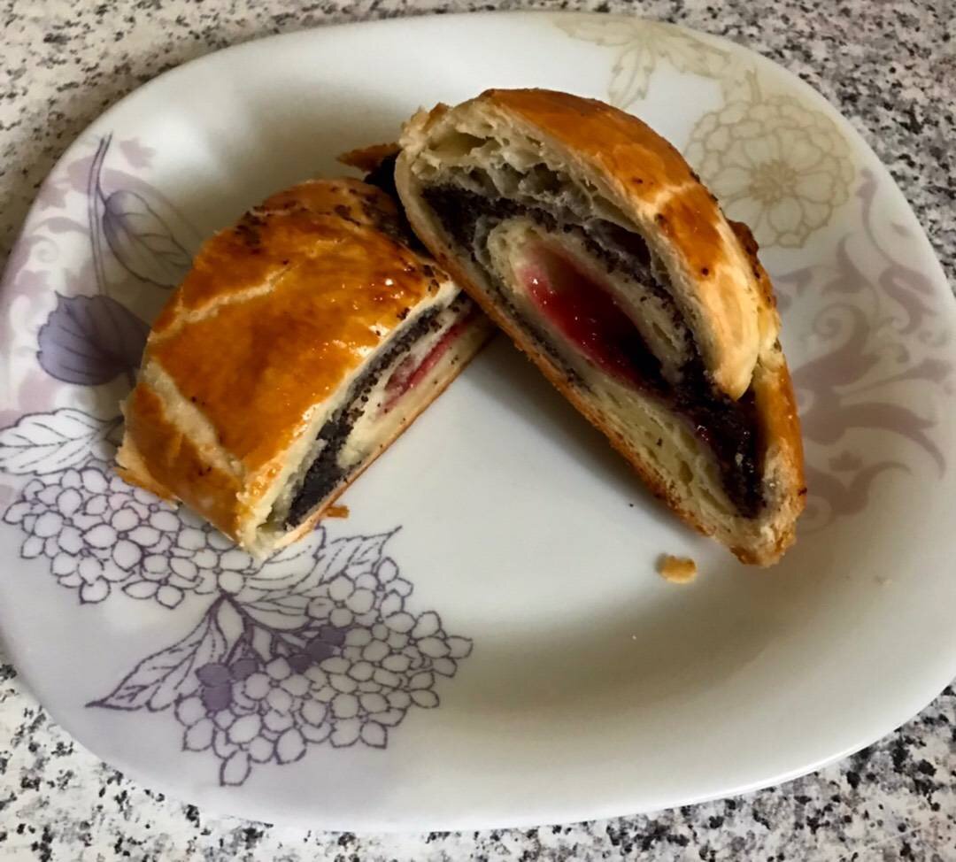 Ингредиенты: замороженного слоёно- дрожжевого теста, яйцо, мака, сах. пудры, крахмала, малинового джема, Орехи, пряности (ваниль, корица и т.д.- по желанию) Способ приготовления: Достаточно быстрый и вкусный пирог с оригинальным вкусом. Размораживаем тесто на столе. У меня такое. Такой джем, если у вас домашний- пробейте погружным блендером, чтоб было меньше косточек. В кофемолке измельчаем мак, провариваем минут 10, добавляем холодную воду и сливаем через мелкое сито. К маку добавляем сах. пудру, пробуем на вкус, потом крахмал и колотые любым способом орешки. Раскладываем тесто на припыленную мукой поверхность, на тесто чуть крахмала, немного раскатываем. На край выкладываем полосу джема. Затем кладём маковую начинку, сворачиваем рулетом, смазываем яйцом и отправляем в заранее разогретую до 200* духовку на 25 минут. Надо перед выпеканием подержать изделие в тепле минут 20, я этого не сделала, и рулет лопнул, поэтому фото не ставлю, но вкус хуже не стал. Сочетание мака и малины очень у