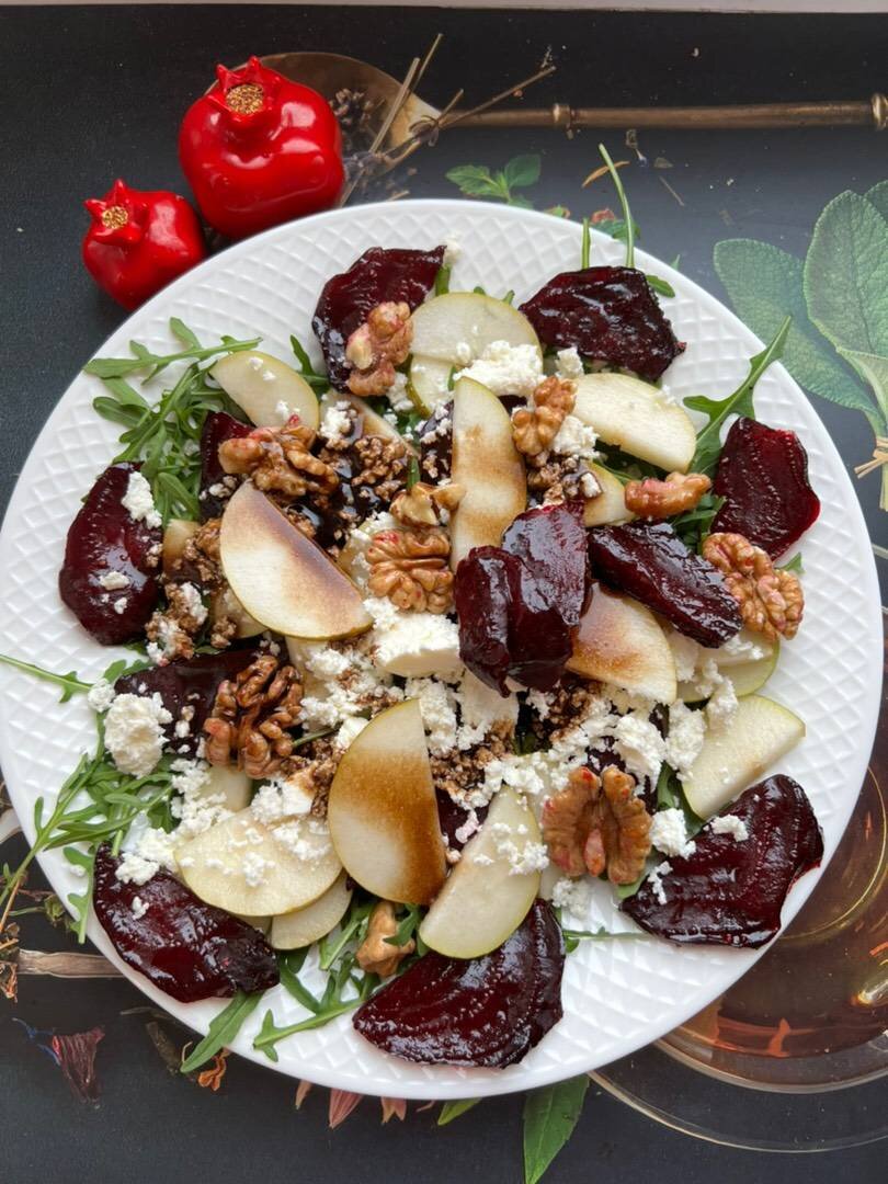 Ингредиенты: руккола, свекла, груша конференц, Брынза , грецких орехов, мёда, оливкового масла, прованских трав, Заправка, мёда, оливкового масла, бальзамического соуса Способ приготовления: Свеклу чистим и нарезаем слайсами. Мы будем ее запекать- я это делаю в мультиварке- выкладываю на дно вместе с грецкими орехами, сбрызгиваю маслом, посыпаю травами и поливаю мёдом. Ставлю на программу выпечки 30-40 минут. Можно все выложить на фольгу, завернуть и запечь в духовке до готовности. Можно и просто отварить🤔. На тарелку выкладываем подушку из рукколы, свеклу, орехи, грушу - произвольно нарезаем, крошим брынзу. Для заправки смешиваем все ингредиенты и поливаем наш салат.