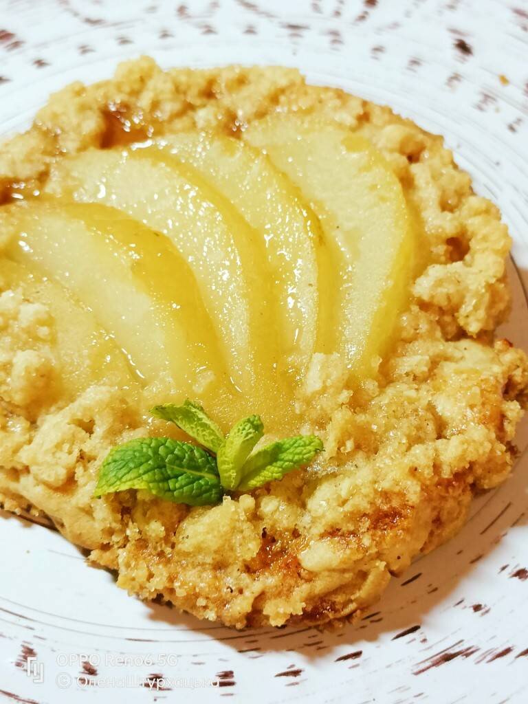 Штрейзель это кондитерская крошка которая служит украшением верхней части изделия из теста . #2тиждень Ингредиенты: Тесто: , сливочного масла, коричневого и белого сахара, холодного молока , муки, разрыхлителя, ванилин, корицы, обжаренных орехов (фундук), Груши:, твёрдые груши , сухого белого вина, сахара, корицы, кардамон, бадьян, Ещё:, сахар, белок, мед или сироп Способ приготовления: Готовим груши: томим очищенные груши в вине со специями 1 час. Тем временем готовим песочное тесто в стиле штрейзель. В миске растираем руками в крошку кубики холодного масло с сахаром. Добавляем молоко, муку, разрыхлитель, ваниль, корицу и мелко на рубленые орехи. Вымешиваем тесто и оставляем в холодильнике на 30 минут. Готовые груши охлажденные разрезаем на 2 части и вырезаем сердцевину. Каждую часть надрезом в виде веера (не до конца верхушки) Тесто делим на 7 частей, 6 на галеты а 7 пойдёт на декоративную крошку. На столе лепим лепёшку в виде груши. Лепим по 1 и толщиной 0,5 см шириной приблизительн