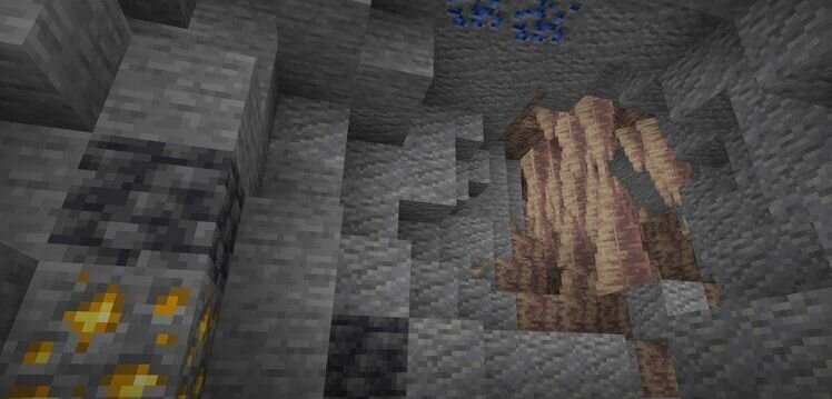 Здесь есть пышные пещеры, где азалия растет свободно, жеоды, наполненные аметистом, богатые жилы медной рудыи – последнее, но не менее важное – большие пещеры, полные сталагмитов из капельного камня. Команда по именованию Mojang была на обеде, поэтому мы назвали их “пещерами из капельного камня”, и они стали нашим биомом недели. Как мы отмечали, когда писали о капельномкамне, вы легко узнаете пещеры из капельного камня по столбам, которые тянутся от пола до потолка, а также по шипам, которые свисают с крыши (известные как сталактиты) или указывают вверх от земли (известные как сталагмиты).