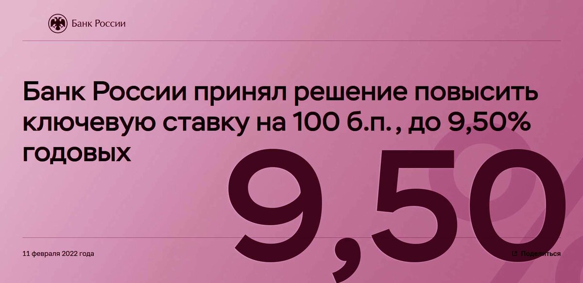 Всем привет! Сегодня Банк России ожидаемо поднял ключевую ставку на 100 базисных пункта до 9,5% годовых. На фоне растущей инфляции (по оценке на 4 февраля она составила 8,8%) ставка вернулась на уровни 2017 года. При этом Банк России не исключает дальнейшего повышения ключевой ставки в 2022 году вплоть до 11%. Если помните декабрьские заявления, то там речь шла о том, что двузначной ключевой ставки Банк России не ожидает, а цель по инфляции на конец 2022 года - 4% годовых. Текущий прогноз по ключевой ставке По прогнозу Банка России, с учетом проводимой денежно-кредитной политики годовая инфляция снизится до 5,0–6,0% в 2022 году и вернется к цели в середине 2023 года. В дальнейшем годовая инфляция будет находиться вблизи 4%. Давайте посмотрим, чем это все грозит инвесторам... Курс рубля По мнению Банка России ориентир на среднесрочную перспективу — 74,5–77,3 за доллар и 85–88 по евро. Банковские вклады На фоне повышения ключевой ставки будет продолжаться рост ставок по банковским вкла