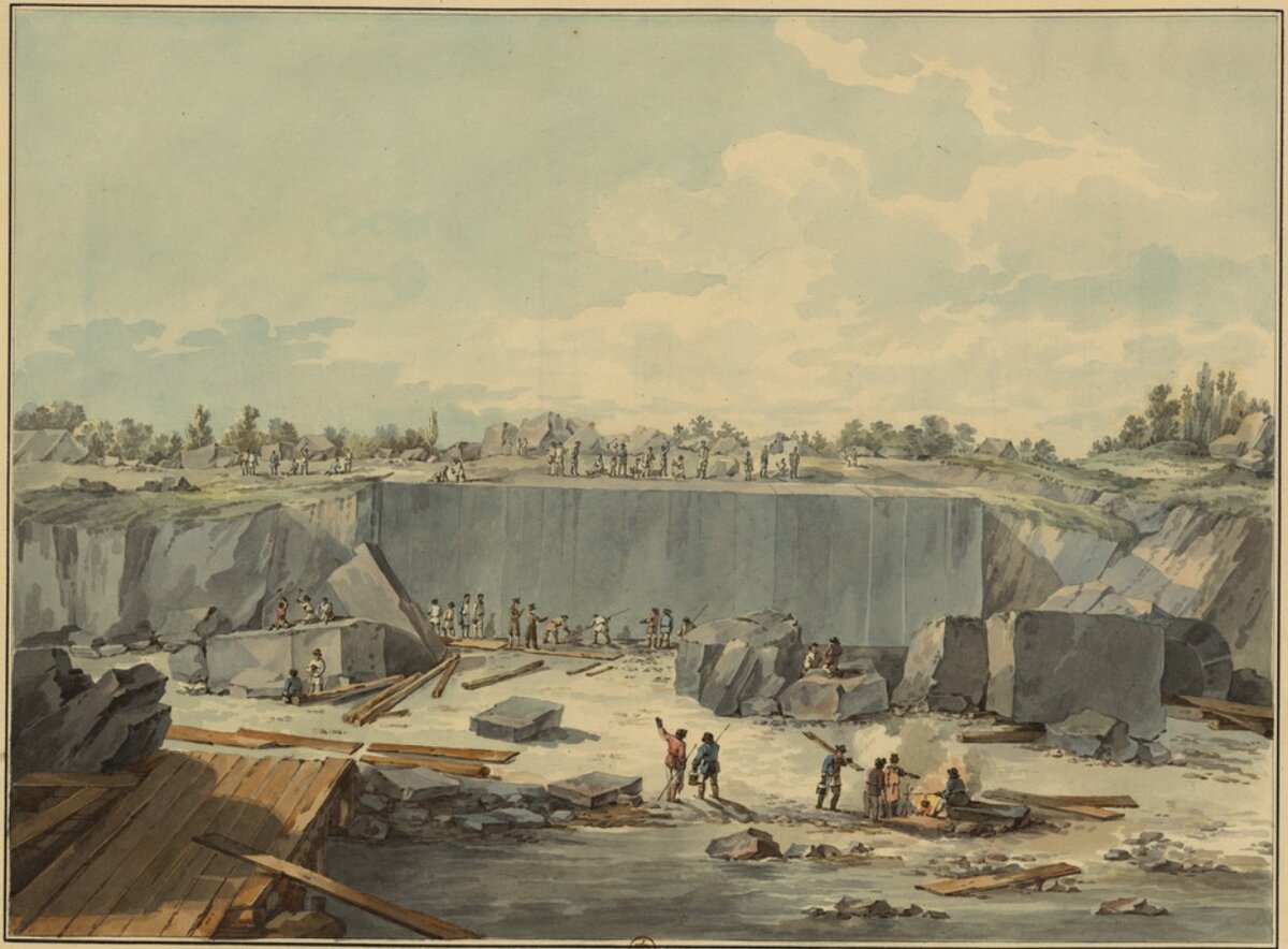 Монолитные колонны Исаакиевского собора только начинали создавать известность каменоломне Питерлакса, когда в 1819 году её посетили Его Королевское Высочество принц Карл Прусский, иностранные послы и несколько других знатных особ. 31 июля 1830 года Его Величество Император своим присутствием соизволил поощрить большие работы, которые велись на этой каменоломне. С этого счастливого времени его часто посещают путешественники, которые отвлекаются от своего маршрута, чтобы полюбоваться скалой, которая была вырублена на протяжении 100 футов, и чей вид представляет собой гранитную стену высотой 22 фута, вырубленную в острой скале с таким совершенством, что только вблизи можно увидеть следы инструментов, которые использовались для этой гигантской работы.