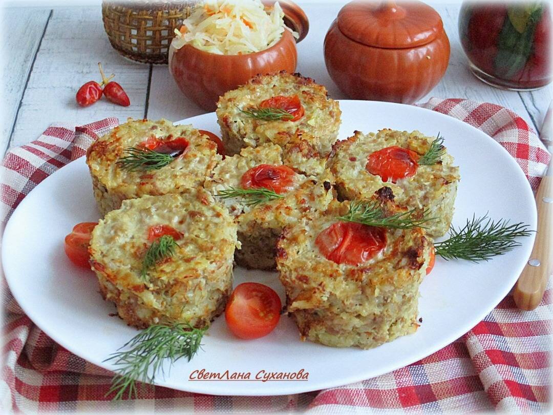 #ленивыеголубцы Ингредиенты: Рис , Фарш мясной, Капуста квашеная, Капуста белокочанная, Лук репчатый, Яйцо , Шампиньоны или помидоры черри (по числу кексиков) , Соль и перец черный (молотый) , Масло растительное Способ приготовления: Берём рис, заливаем водой в соотношении 1 к 2, доводим до кипения и варим на медленном огне 20 минут. Свежую и квашеную капусту, репчатый лук, измельчаем их ножом или с помощью блендера. Добавляем к мясному фаршу измельчённые овощи, кладём яйцо. Кладём варёный остывший рис, добавляем по вкусу соль и молотый чёрный перец. Тщательно перемешиваем. Если делаете с грибами, то смазываем их, чтобы не высохли, растительным маслом. Ставим в нагретую до 200 градусов духовку и выпекаем 30-40 минут. Берём формочки для кексиков, смазываем их кисточкой растительным маслом. Кладём ложкой фарш. У меня получилось 9 штук. Сверху вдавливаем шампиньоны или помидоры черри.