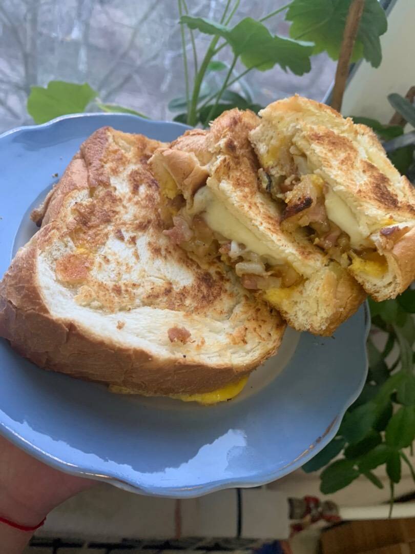 На сковороду выкладываем хлеб, в середину кладём картофель, заливаем взбитым яйцом, кладём сыр и накрываем мякотью, которую вырезали раньше.