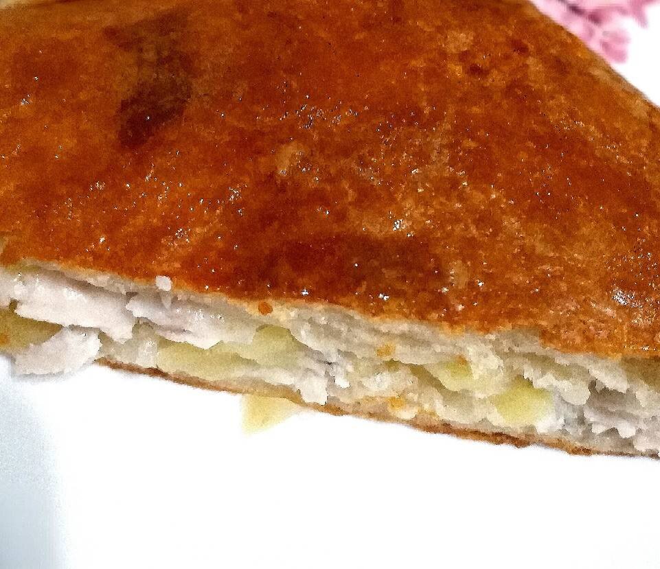 Вкуснейший пирог 👍😋😋😋 Один из любимых в нашей семье. Ингредиенты: Начинка:, гр куриная грудка или бедро без косточек, большая луковица, картошка не крупная, Соль, перец по вкусу, гр Масло сливочное или растит, Тесто:, гр Кефир или молоко, гр Вода, ч л Соль, ст л Сахар, , 5 ст л дрожжи сухие, гр Масло растит, .гр.Мука (ориентируемся +. - мука разная и влажность) Способ приготовления: Заводим тесто из заданных продуктов. Двойной обмин. В тёплое место. Примерно 1 - 1,5 часа Мясо режем мелкий кубик, так же лук и картофель Перчим, солим. Добавляем сливочное масло. Выпекаем t 200. 10 минут Затем снижаем до 180 град. Всего выпекаем примерно 40 50 минут зависит от духовного шкафа. Формируем пирог по вашей форме круглый или любая форма. Защипываем и делаем в середине отверстие при необходимости можно добавить 2 ложки воды или молока. Дырку закрываем маленьким шариком из теста. Смазываем кусочком сливочнлго масла. ПРИЯТНОГО АППЕТИТА.