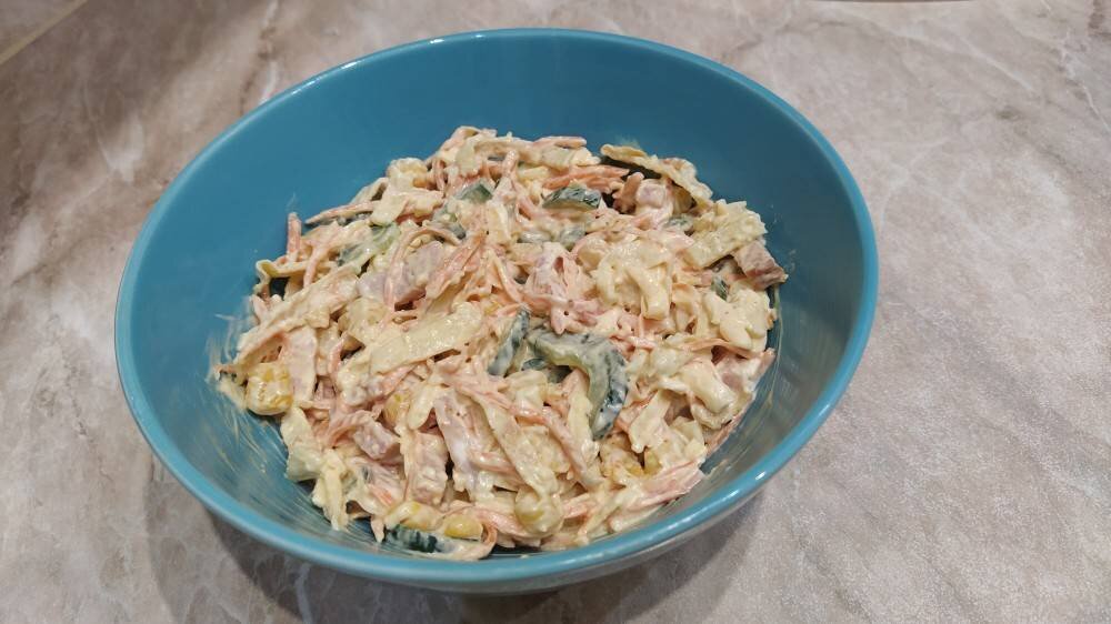 #игры #меню Сытный салат может быть как основным блюдом, так и украсит праздничный стол Ингредиенты: окорок в/к или любая колбаса, консервированной кукурузы, длинноплодный свежий огурец, твердого сыра, моркови по - корейски, яйца, майонеза Способ приготовления: Яйца взбить с щепоткой соли и испечь блины. Охладить и порезать соломкой. Окорок порезать брусочками. Сыр натереть на крупной тёрке. Огурец разрезать вдоль пополам и удалить серединку (семена можно оставить, но я не хотела лишней жидкости в салате), порезать брусочками. С кукурузы слить жидкость. Все (морковь, окорок, кукурузу, сыр, блинчики, огурец) сложить в салатник и заправить майонезом. Приятного аппетита!