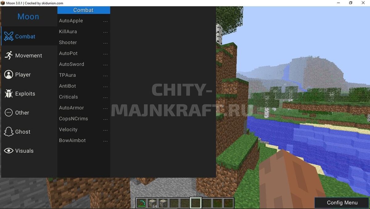 Описание чита Moon 3.0.1: Довольно необычный чит-Moon 3.0.1 по дизайну. В нём 7 вкладок: Visuals, Combat, Ghost, Player, Exploits, Movement, Other. Особенности: Функции чита: AntiBot — игнорирование ботов, которые создают анти-чит. Criticals — позволяет вам атаковать критическими ударами по игроку. AutoArmor — одевает на вас автоматически броню. Ну, думаю, самые главные и интересные функции были рассказаны. Недостатки чита: Какие-то функции не работают, но они не так важны. Как установить чит Moon 3.0.1 на Майнкрафт 1.11.2: 1. Скачайте и откройте архив при помощи программы WinRar или Zip.
