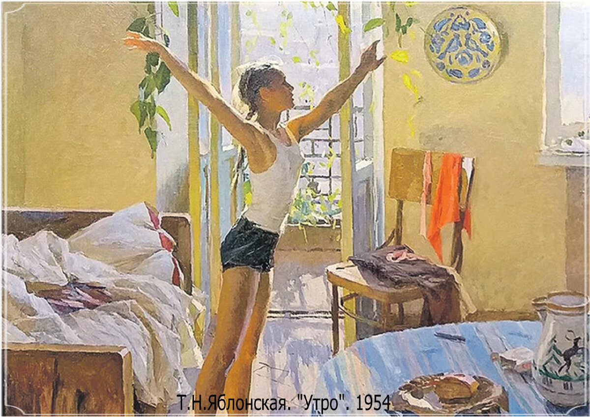 Наверняка, каждый, кто учился в советской школе, помнит эту репродукцию картины Татьяны Яблонской. Помнит, как всем классом учились описывать её сюжет, колорит, фигуру девочки. И, конечно, ждали оценки за сочинение. На этом светлом полотне девочка-подросток начинает новый день своей юной жизни - с открытым настежь балконом, с порывом ввысь всем своим существом. Зритель верит не только в счастливый день этого юного создания, но и в долгую, красивую жизнь. «Утро», 1954 год. Дочери Татьяны Яблонской Лене 13 лет. Они живут вдвоём в маленькой комнатке киевской коммуналки. Отец Лены, ушедший в 1941 на фронт, увидел родившуюся в тот год дочь только после войны. Но семейная жизнь супругов-художников не сложилась, и родители расстались. Татьяна Ниловна продолжала писать картины. Дочь вдохновенно изучала ботанику, разводила цветы и мечтала выйти замуж за лесника. Но по настоянию матери после школы поступила в Строгановское училище. А утренняя картина художницы быстро стала популярной. Напечатан