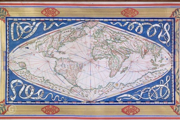 Возможно, что это - такая же "допотопная" карта, как и карта Фра Мауро 1459 года, т.е., она была создана до глобального Потопа, уничтожившего цивилизацию поздней античности, которая в официальной истории названа "Эпохой Возрождения". Обратите внимание, что Северный географический полюс на этой карте расположен в Гренландии, а многие сооружения допотопной эпохи (включая, кстати, не только Исаакиевский собор и Петропавловскую крепость, но и весь исторический центр Санкт-Петербурга) имеют ориентацию именно на такое расположение географических полюсов.