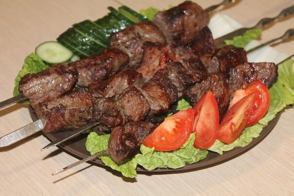 МЯСО-1кг. ЛУК-150г. ПЕРЕЦ КРАСНЫЙ-0,5г. Мясо разделить на куски по 40-50г. , добавить мелко нарезанный лук , перец , соль . Сложить в эмалированную посуду и поставить в прохладное место на 2 часа . Куски надеть на шампур и жарить на раскалённых углях . К шашлыку подать свежие огурцы , помидоры и зелень .