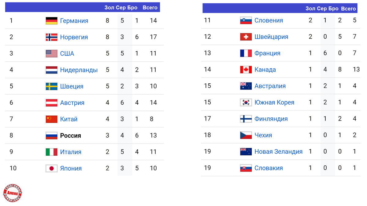Подводим итоги 8-го дня на Олимпиаде. Сегодня разыграли 6 комплектов медалей. Узнаем, кто лидирует. Сноуборд. Смешанные команды. Кросс Американская пара Джакобеллис и Баумгартнер выиграла золото. Если вы внимательно следите за нашими обзорами, то помните, что Джакобеллис выиграла эту дисциплину в личном заезде. А вообще, смешанные соревнования по сноубордингу впервые представлены на Олимпиаде. Италия была второй. На третьем месте расположилась Канада. Лыжные гонки. Женщины. Эстафета 4*5 км Сборная России в составе Ступак, Непряевой, Сориной, Степановой, выиграла эстафету, показав время 53 минуты 41 секунду. Последний раз россиянки побеждали в эстафете в 2006 году. Германия – вторая, отстав на 18,2 секунды. Шведская четвёрка – третья. Конькобежный спорт. Мужчины. 500 м Гао Тинъюй из Китая – первый. Победитель завершил забег за 34,32 секунды, что стало новым олимпийским рекордом. Сборная Китайской Народной Республики завоевала 4-е золото, но осталась 7-й. Ча Мин Кю из Южной Кореи – втор