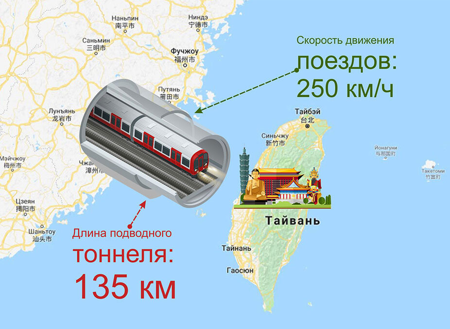 В 2021 году председатель КНР товарищ Си Цзинпинь представил инфраструктурный план развития Китайской Народной Республики. Это характерно для плановой экономики (хотя в КНР есть нюансы). Представлено много проектов, центральное место, конечно, развитие структуры "Один пояс, один путь". Но интерес вызывает другой мегапроект. Согласно представленному плану в 2030 году между материковым Китаем и его мятежной провинцией будет построен тоннель. Похожий на тоннель под Ла-Маншем: три параллельных профиля – два для поездов, между ними один служебный. Длина сооружения 135 км. Время от одной точки до другой - полчаса. Есть и дата окончания строительства - 2030 год. У КНР большой опыт в строительстве такого рода тоннелей. Десятилетие назад на строительство похожего по параметрам проекта - Тоннель Далянь — Яньтай - отводилось 10 лет. Сейчас, возможно, лет 7 - 8 лет. Идея такого тоннеля гуляла давно, но вот чтобы она воплотилась в официальных документах, это произошло впервые. Причем, чтобы еще