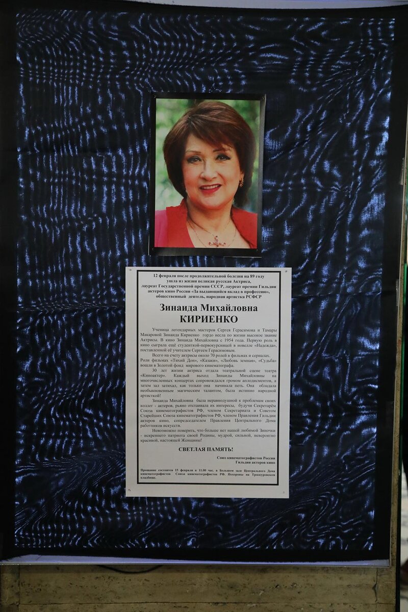 На излёте зимы простились с легендарной актрисой,,, Выступила на панихиде подруга Кириенко Лариса Лужина: — Грустно и тоскливо осознавать, что я больше не услышу ее голоса. Мы часто созванивались. Она звонила и спрашивала: «Лоретта, как дела?» Больше так меня, кстати, никто не называл. Также Лариса Анатольевна рассказала забавный случай, как однажды на их совместном концерте в Ялте среди зрительниц оказалась сама Галина Брежнева. Так вот, под песню «Ну-ка, чайка, отвечай-ка» в исполнении Кириенко дочь генсека неожиданно встала со своего места и начала кружиться и пританцовывать. Стоит ли говорить, что после окончания концерта она пришла к артистам в гримерку и долго благодарила Зинаиду Михайловну за радость, которую та ей подарила. Так получилось, что мне довелось побеседовать с Зинаидой Михайловной незадолго до её ухода. Она очень переживала из-за своей невостребованности. Под конец нашей беседы (полностью видео-вариант внизу) сказала: Я бы хотела воскреснуть для зрителя... Почему? Да