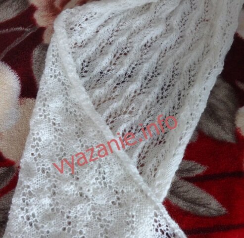 Палантин — это разновидность шарфа. Расскажу, как связать белый палантин. Его размеры 60 см в ширину и 2 м в длину. Вяжется легко, выглядит элегантно. Вязать будем спицами №5 пряжей ALIZE ANGORA GOLD (100 г = 550 м 2 мотка). Описание. Набираем 100 петель. Один ряд вяжем изнаночными. Дальше по схеме. У нас будет 11 раппортов. Один раппорт состоит из 9 петель и 20 рядов. Палантин спицами. Схема узора Вяжется легко. Сложность заключается в том, как вязать кромочные. О них чуть позже. Пока опишу раппорт узора. В первом ряду *5 лицевых, накид, лицевая, накид, 3 вместе лицевой*. 3 вместе лицевой вяжем так: 1 петлю переснимаем, как лицевую, 2 вместе лицевой и затем снятую петлю накидываем на получившуюся петлю. В чётных рядах все петли изнаночные. Изнаночные я вяжу классические. Накиды вяжем не скрещенные, чтобы получались дырочки широкие. 3 ряд. Дальше накиды будут смещаться вправо. *4 лицевые, накид, лицевая, накид, лицевая, 3 вместе лицевой.* 5 ряд. *3 лицевые, накид, лицевая, накид, 2 лиц