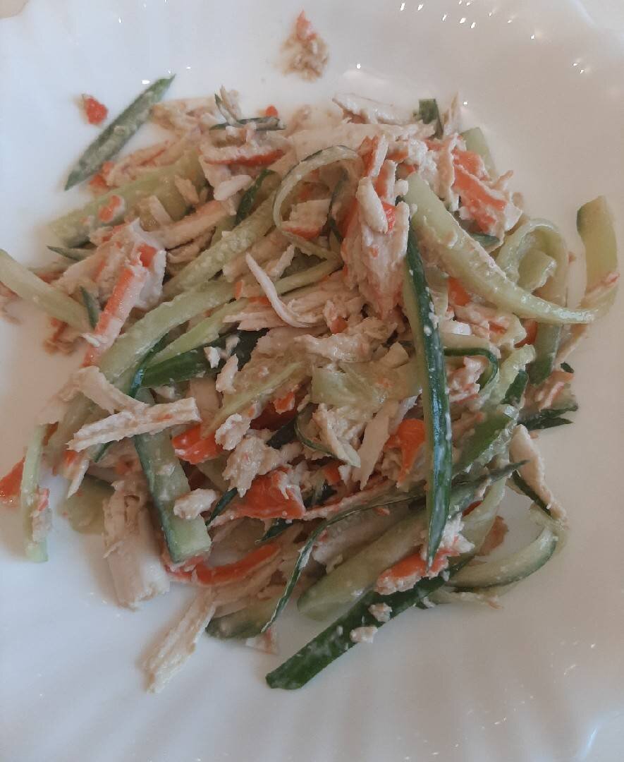 Очень простой и вкусный салатик😋 Ингредиенты: крабовые палочки, средних огурца, соевый соус, майонез, кунжут по желанию Способ приготовления: Разделить крабовые палочки вилкой. Нарезать огурцы, таким образом, чем тоньше тем лучше)). Заправить соусом и майонезом. Посыпать кунжутом. Кушать с удовольствием. 😋