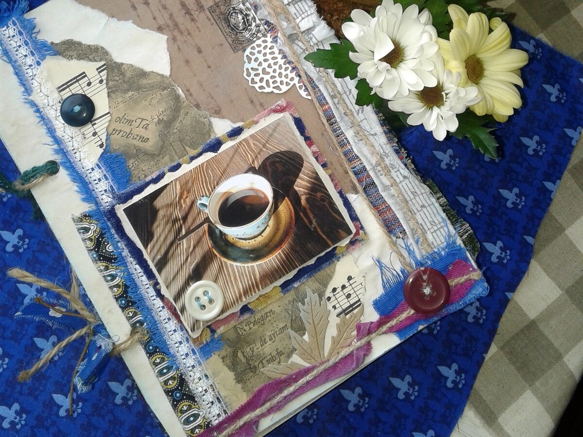 Однажды я пролила кофе, "натопала" донышком чашки круглых и лунообразных следов и вспомнила, что так декорируют кофейные странички в скрапбукинге. И вот он, кулинарный блокнотик для рецептов - созрел, нежится в руках, дразнит, приглашает полистать странички. Немного шитья на машинке, работы с клеем, утопления страниц в кофе. Игры с пуговками, верёвочками, фотографиями. Сбор всего этого не на банальные кольца, а на верёвочки, которые так интересно завязывать и развязывать, если понадобится вставить ещё странички... Плюс моё кофейное стихотворение и кармашковая книга готова украсить кухню, стать хранителем семейных рецептов. Лоскутное богатство радует взгляд и обещает неожиданные открытия. Внутри, в кармашках я всегда прячу подарочки - материалы для декора страничек, дизайн которых придумает новый обладатель блокнота. Ещё бонус - бумажки, картинки которые помогут в дальнейшем оформлении книги. Это обратная сторона. Стягивает блокнот круглая шляпная резинка, чтобы вставленные меж с