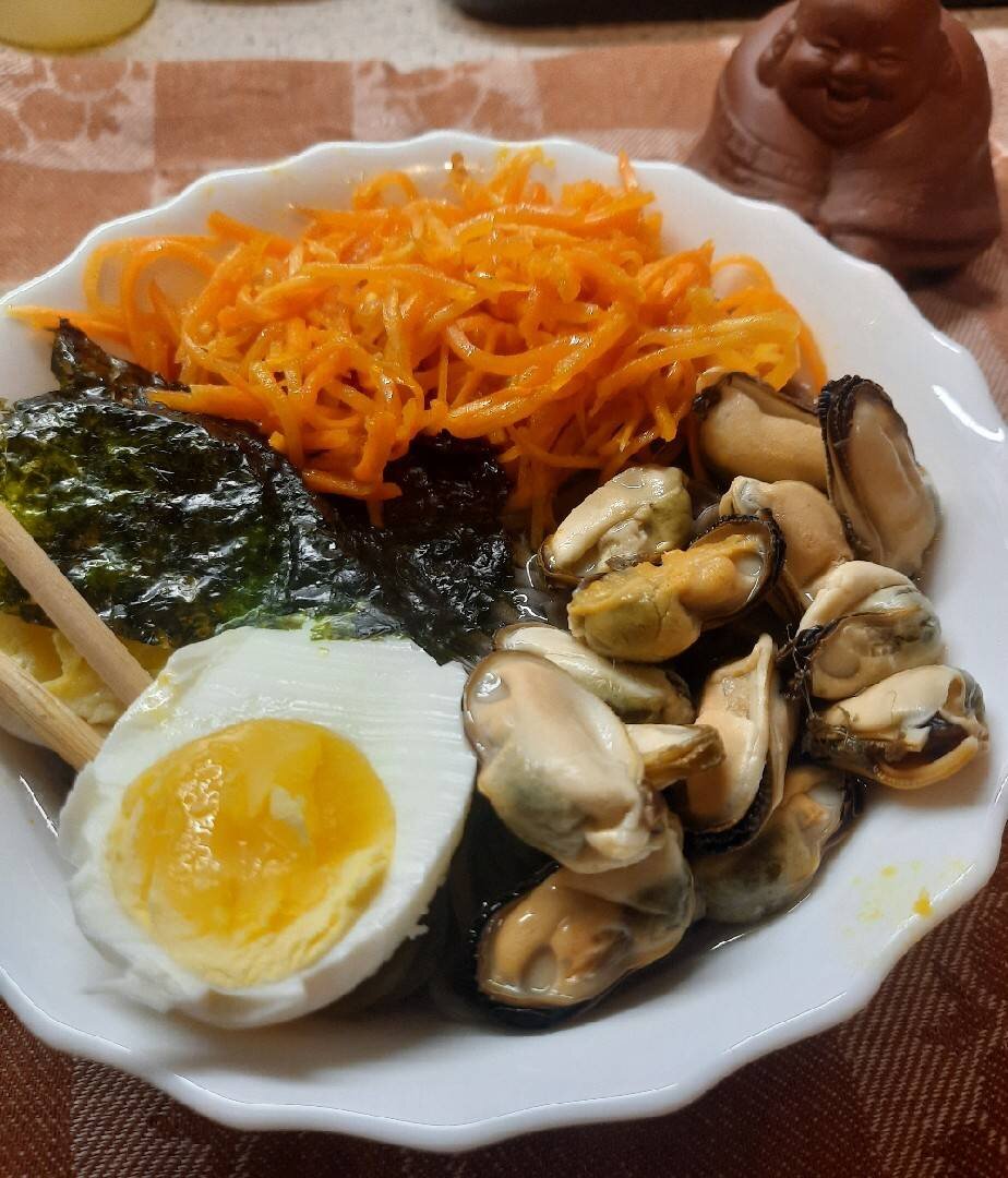 #игры это самый быстрый суп и очень нравится ребенку Ингредиенты: гречневой лапши, яйцо, нори, моркови по-корейски, мидий в собственном соку, Соль Способ приготовления: Лапшу отварить в кипящей подсоленной воде 10 минут. Выложить лапшу в тарелку и залить водой, в которой она варилась. Яйцо отварить, почистить, разрезать пополам и положить в тарелку. Добавить морковь по-корейски, листик нори и мидии. Приятного аппетита. Если Вам понравился рецепт: буду рада увидеть Ваши фотоотзывы и комментарии.