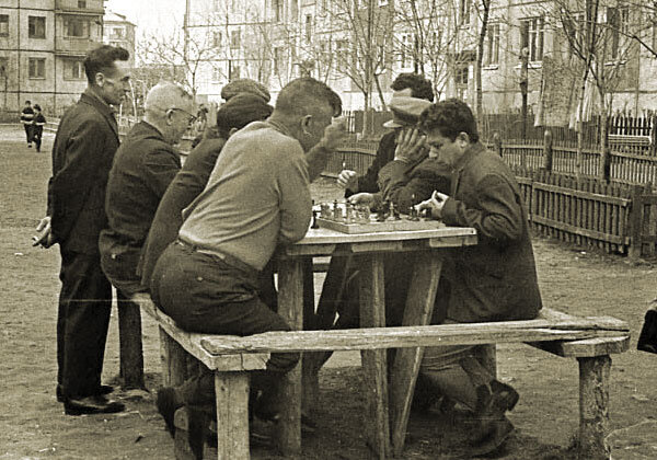 Здравствуйте, дорогие друзья! Сегодня мы ненадолго мысленно перенесемся в годы существования СССР и еще раз почувствуем дух той эпохи. Немного телевидения, спорт, предметы быта и цены той поры могут нам вновь заглянуть в советские времена. В Советском Союзе пик строительства хрущевок пришелся на 60-е годы. Все больше советских граждан перебирались из коммуналок в отдельные квартиры. И пусть они были небольшие с маленькими кухоньками, но, тем не менее, это было отдельное жилье со всеми удобствами. Новоселы обживали свои квартиры, а вместе с ними и дворы, в которых любили собраться не только дети, но и взрослые. В каждом дворе или где-нибудь рядом обязательно сколачивали такой вот столик, за которым собирались любители домино или шахмат. Этот вид отдыха советских людей не раз был запечатлен не только на фотографиях, но и в кинофильмах отечественного кинематографа. Да кто из нас, чье детство пришлось на те годы, не помнит доминошный стук, допоздна раздававшийся со двора. Мысленно вы уже в
