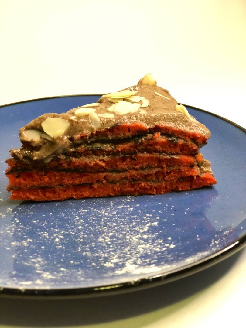 #меню #блинныйторт #тортнасковороде # Самый простой, лёгкий и очень вкусный торт😋 Этот рецепт подойдёт всем и для тех, кто смотрит за своей фигурой. По рецепту можно- меньше добавить сахар. Пробуйте и угощайте своих любимых 👩🏽🍳🤍 Ингредиенты: Тесто:, яйцо куриное, сахар, по вкусу ванильный сахар, соли, растительное масло, мука пшеничная, кефир, ст л какао-порошок, разрыхлитель, соды/уксус погасить, краситель красный, Крем:, греческий йогурт, ст л какао-порошок, ст л сахарная пудра, миндальных лепестков Способ приготовления: Подготовить все ингредиенты для приготовления. В миску влить яйца с сахаром, взбить венчиком, добавить ванилин. В теплый кефир в отдельной посуде добавить разрыхлитель и каплю красителя, перемешать и дать постоять 2 минуты, затем влить в тесто и всё перемешать. Влить растительное масло. Просеянную муку добавить, перемешать. Соду на кончике погасить уксусом, добавить в тесто и обжарить на сковороде с обеих сторон блинчики, их получилось 5 штук. Приступить к приг