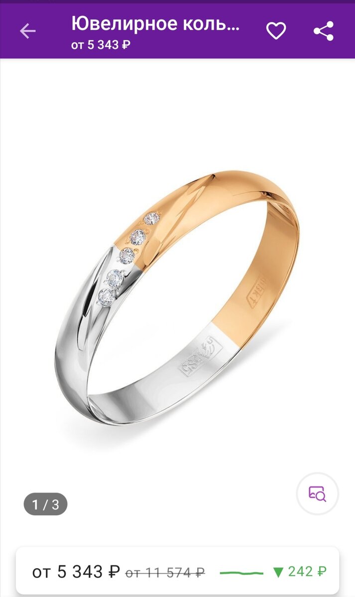 Привет, друзья!!!! На Wildberries часто заказывает сестра и у неё большая скидка, и плюс на самом сайте были распрадажи на золото 50%,читала отзывы, там кто - то написал, что кольцо уже пришло, спёрли. Что - то мне не верится там же все отслеживается и сами сотрудники зачем будут так рисковать. Кольцо из комбинированного белого и золотистого золота, в нем три камушка фианит. Очень аккуратненько сделано. Фото с сайта вам покажу, что правда там его заказывала. Стоило оно 11574,а я купила за 5343р. Ну намного дешевле, чем в магазине. Давно я себя не радовала подарками. Я не люблю громоздкие кольца. Люблю тоненькие. Размер кольца 16,5, вес 1,36 гр. Размер соответствует. Обычно все на Wildberries приходит в прозрачных пакетах, а тут я удивилась, было упаковано в тёмный полителен. Я распечатала сразу посмотрела все- ли в порядке и главное хотелось узнать, правда- ли золото или нет. Первый раз золото там заказывала, как - то было страшновато. Но я довольна покупкой, нежнейшее колечко,